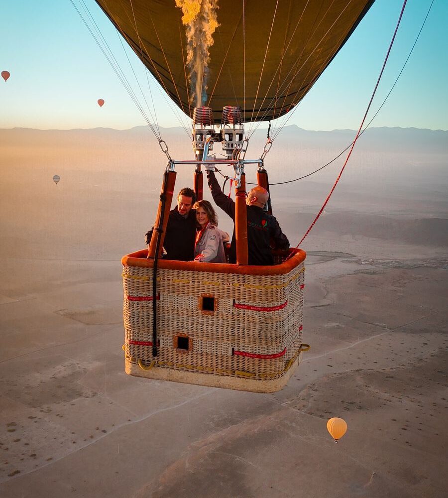 C’est le moment wow ! Vous décollez en douceur au lever du soleil. Le spectacle est total : les paysages de Marrakech, les villages berbères, les collines, le désert d’Agafay et les cimes de l’Atlas s’offrent à vous dans un silence absolu.