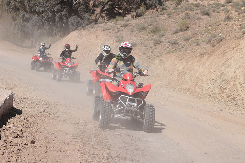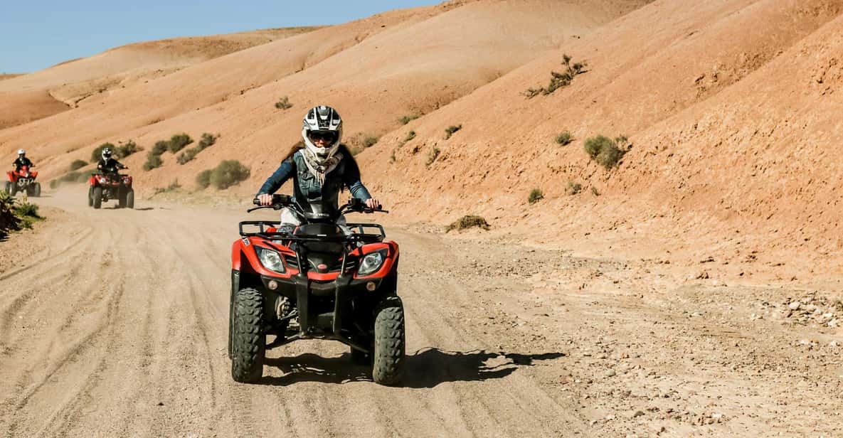 Après un rapide briefing sécurité et la remise de l’équipement (casque, lunettes), vous partez pour un circuit en quad à travers les paysages spectaculaires d’Agafay : pistes désertiques, plaines rocailleuses, vues sur l’Atlas et villages berbères.
