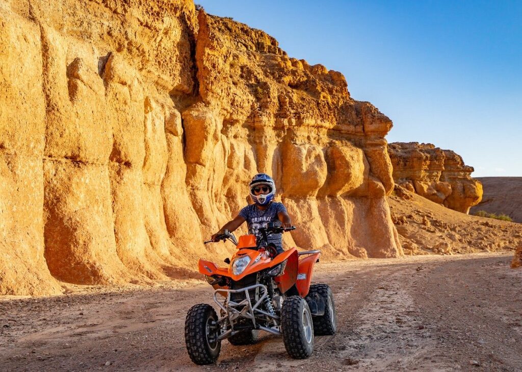 Commencez par une balade en quad à travers les pistes sauvages et les paysages lunaires du désert, entre plateaux arides et villages berbères. Après une pause thé bien méritée chez l’habitant, partez pour une marche paisible à dos de dromadaire, en tenue traditionnelle, au moment magique du coucher de soleil.